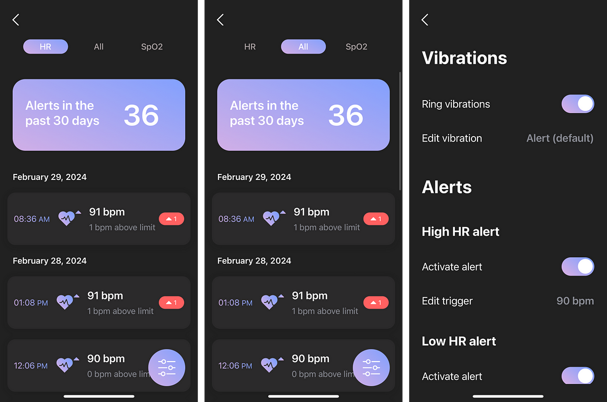 It allows you to set HR and SP02 limits for when the ring should vibrate and alert the user when the set limits are exceeded. Personally, I would probably like to see an additional setting that takes movement into account. For example, whether to alert me to a higher HR when I am moving or when I am at rest. Now the alert is sent regardless of whether you are moving or not.