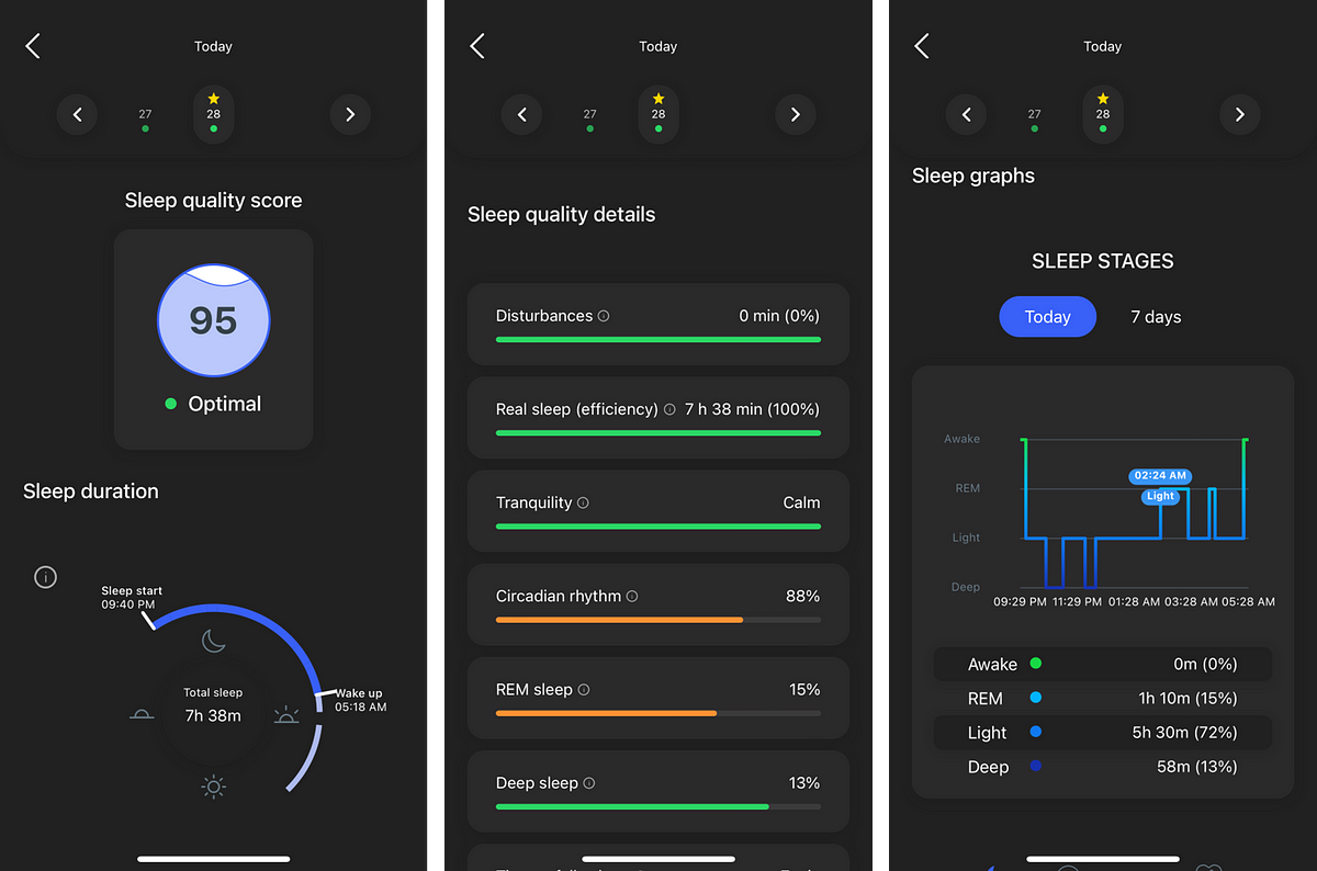 The sleep section provides some fairly basic information that probably wonât surprise you. This is primarily the sleep quality score and then the individual attributes, which include sleep time, efficiency, sleep stages, etc. See more in the images below.