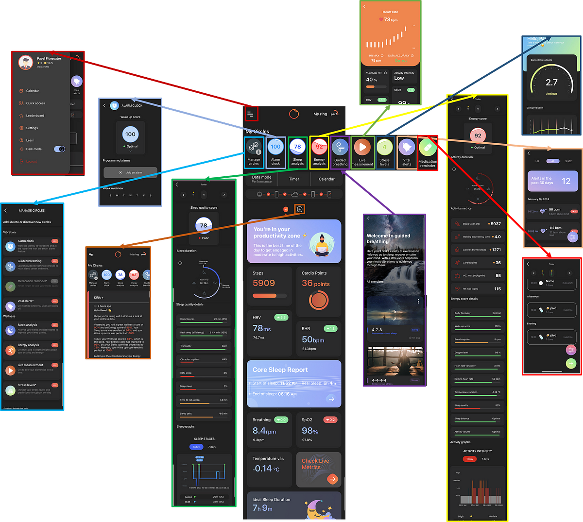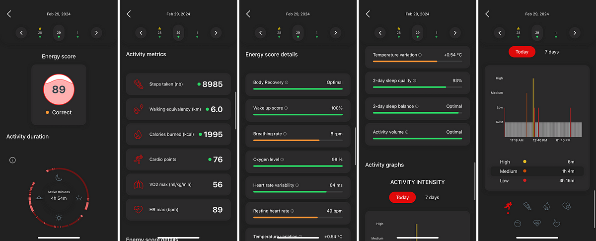 - Dashboardâââwhere you can find basic metrics for the day or last night: steps, cardio points, HRV, RHR, respiration rate, SpO2, temperature var. etc.