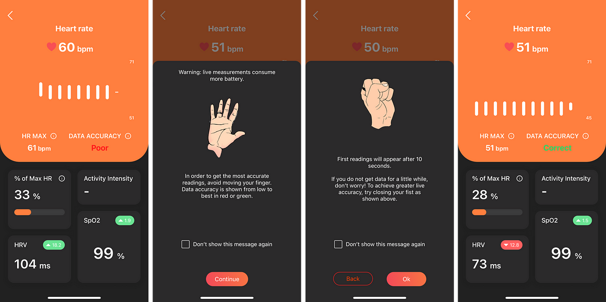 Live measurement is used to measure instantaneous HR, HRV and SPO2 values. The ring indicates that a resting state is required for good accuracy.