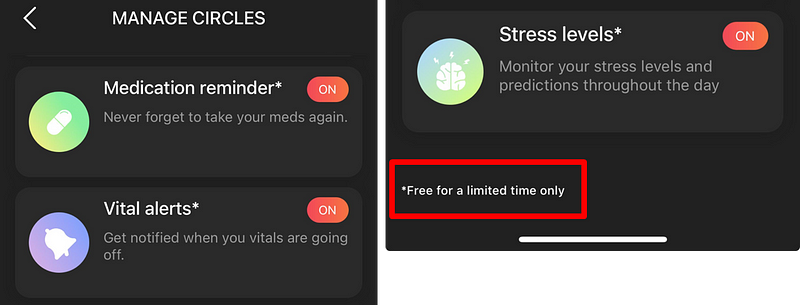 However, a rather subtle footnote has recently appeared in the Customise Circles sectionââânamely that Stress, Meds and Vital alerts are free for a limited time only.