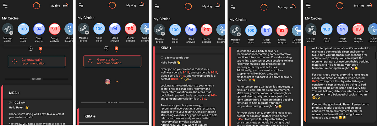Iâm really spoiled by the Oura ring and the daily Readiness recommendations. They are short and to the point. Circular is betting on AI in this area with the name Kira+. However, so far these recommendations have tended to be very general in nature, with AI sauce around them.