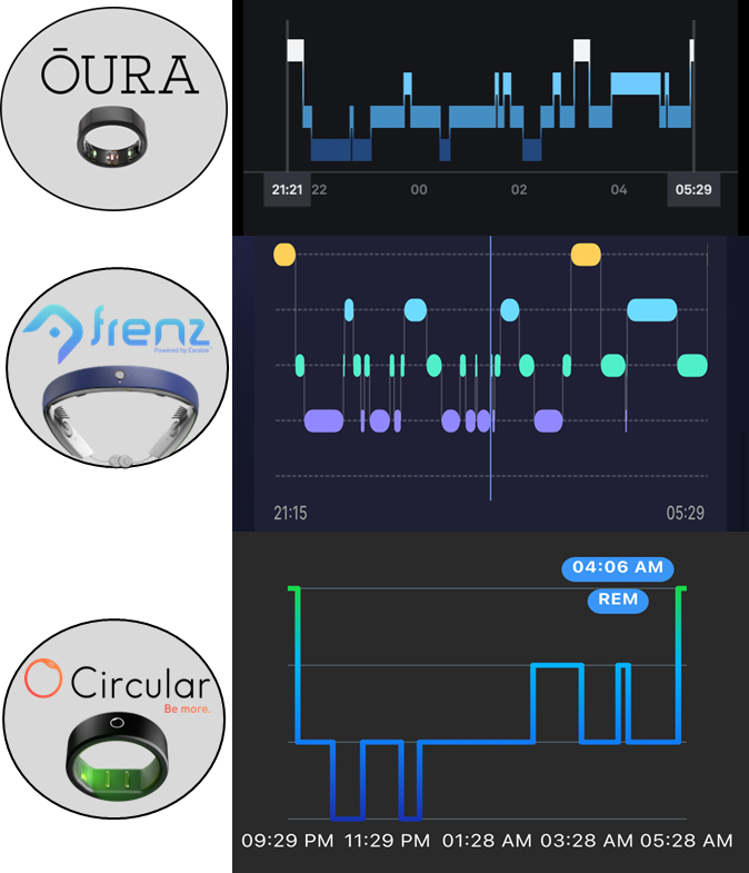 The accuracy of determining sleep stages is somewhat weaker. Sometimes the hypnogram is downright dubious and poorly segmented. For validation and demonstration, I chose one night and compared it to the leader, the Oura ring, and also to the FRENZ Brainband headband (which cascaded through the study with 87.8% agreement against the PSG gold standard).