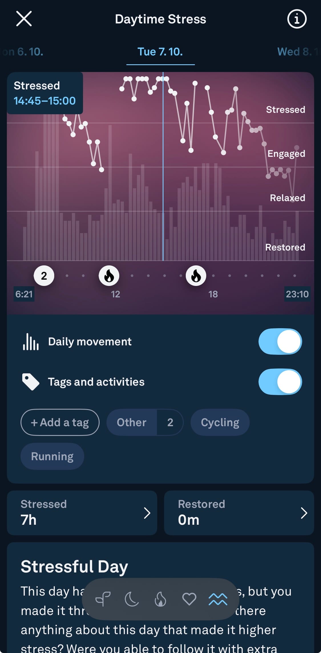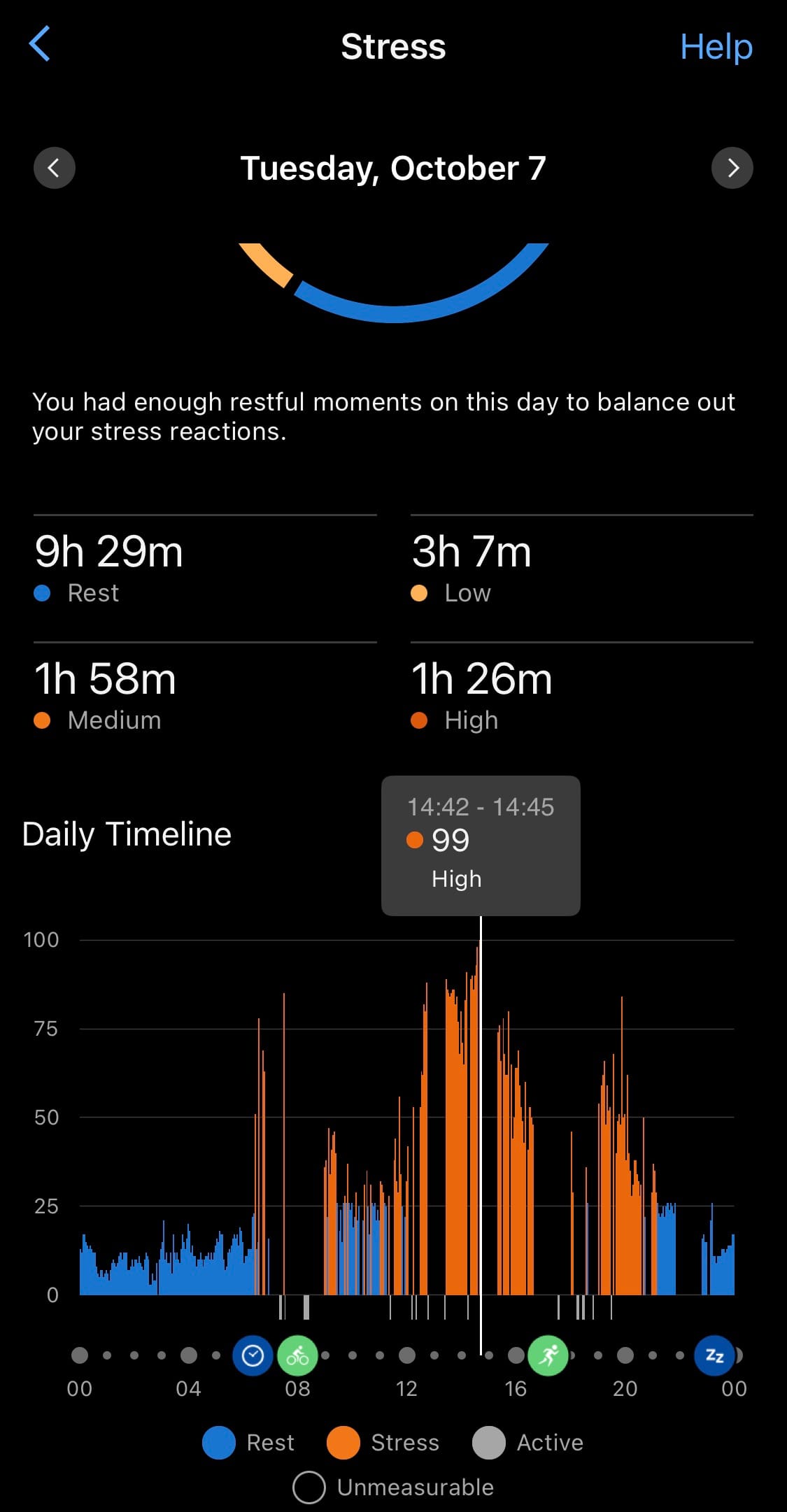 Oura interpreted the data from essentially the entire afternoon as being in “Stressed” mode — and honestly, it wasn’t wrong. On my way to the interview, I ran into an unexpected traffic jam, which added a little bonus round of nervousness. I’d definitely classify that period as “stressed.”