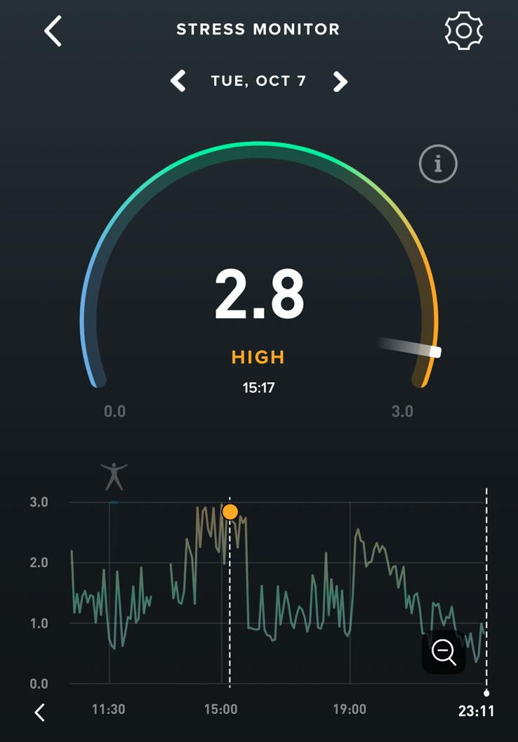 All three devices flagged the more nerve-wracking parts of the day as stress — though each used a different method of interpretation and visualization.
