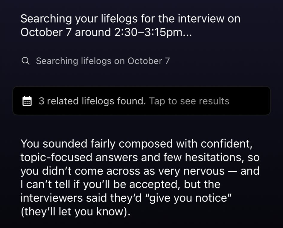 I’m still exploring possible use cases for the Limitless Pendant — a wearable pendant that listens to everything around you and then lets an LLM model creatively (and sometimes questionably) interpret what it heard. :)