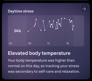 For a long time, the Oura was primarily a night-time device, with daytime use as a pedometer or activity tracker. But that has changed recently. The Oura now tracks daytime stress very well and, fantastically, also calculates temperature in this metric. If it’s high, it displays it like this: