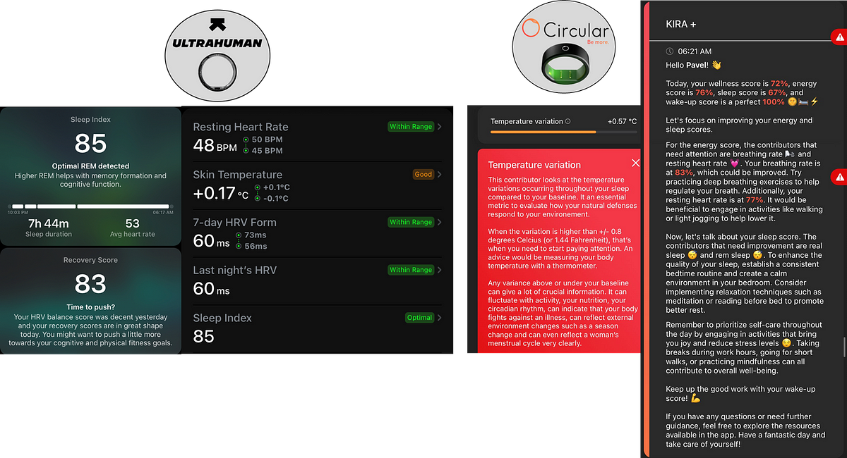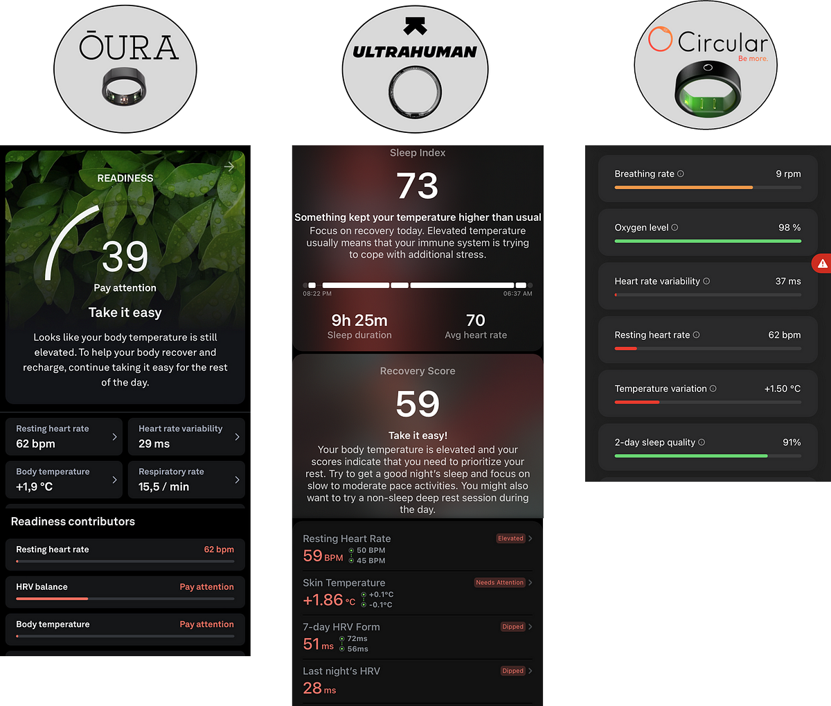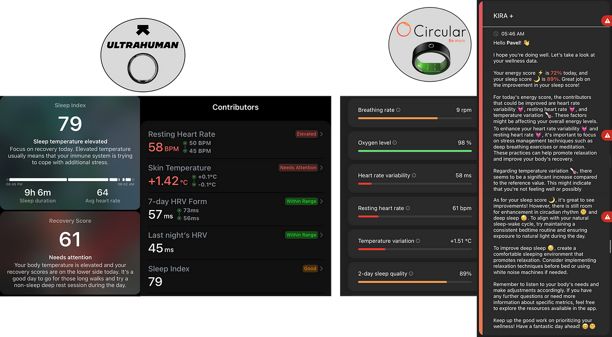 - Circular Slim: ➕1.51 °C, ⬆️ RHR = 61 bpm , but also ⬇️HRV = 58 ms