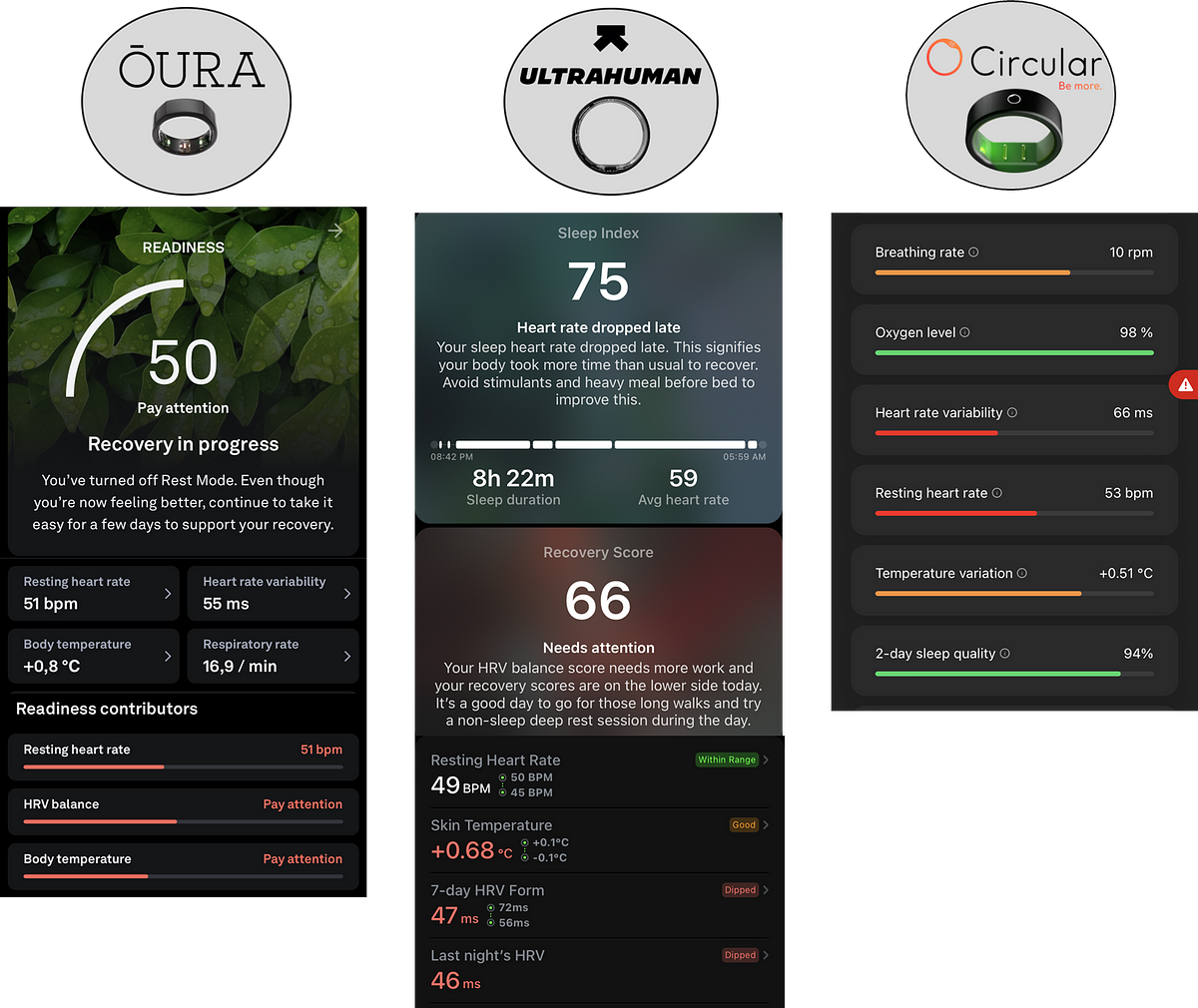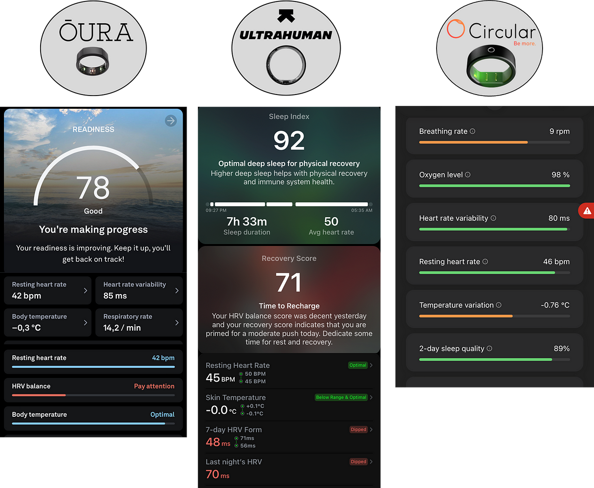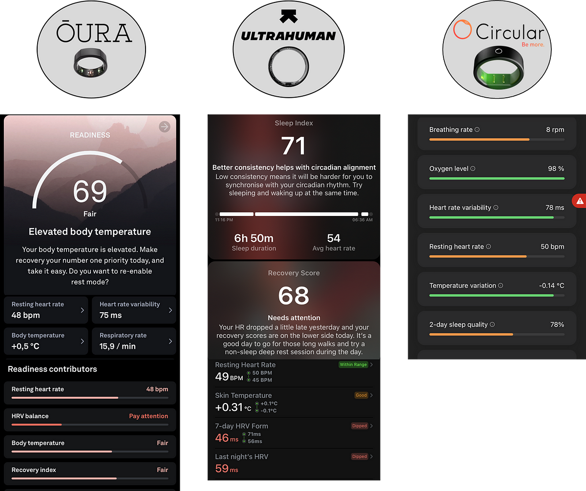 - Circular Slim: ➕1.51 °C, ⬆️ RHR = 61 bpm , but also ⬇️HRV = 58 ms