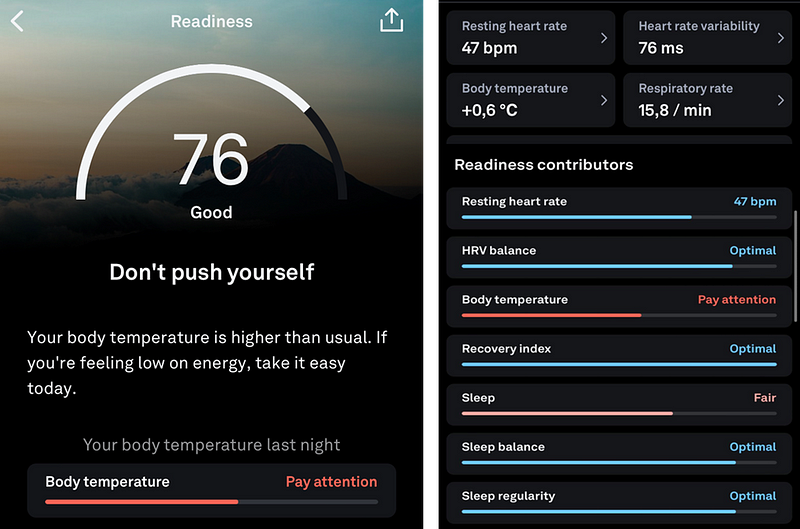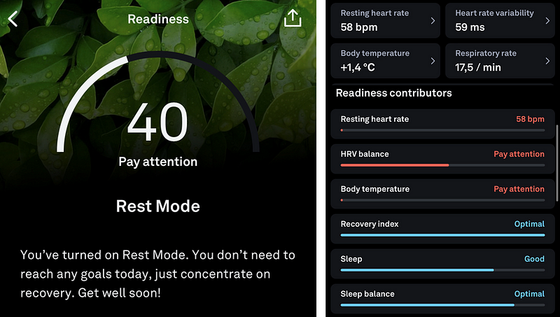 And Oura confirmed my hunch (unfortunately or fortunately?) in Readiness, which she based mainly on a slightly elevated temperature. That is ➕0.6°C.